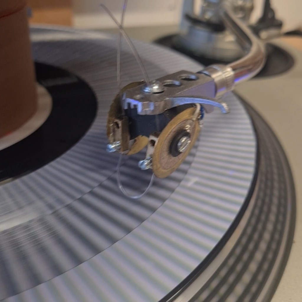 Most recently I wanted to play back a ‘tone’ record with lots of raised stickers on it, so didn’t want something that would damage the disk – fishing line proved very effective and also solved the difficult issue of making both sides of the stylus the exact same length to make contact with the record at the same time.