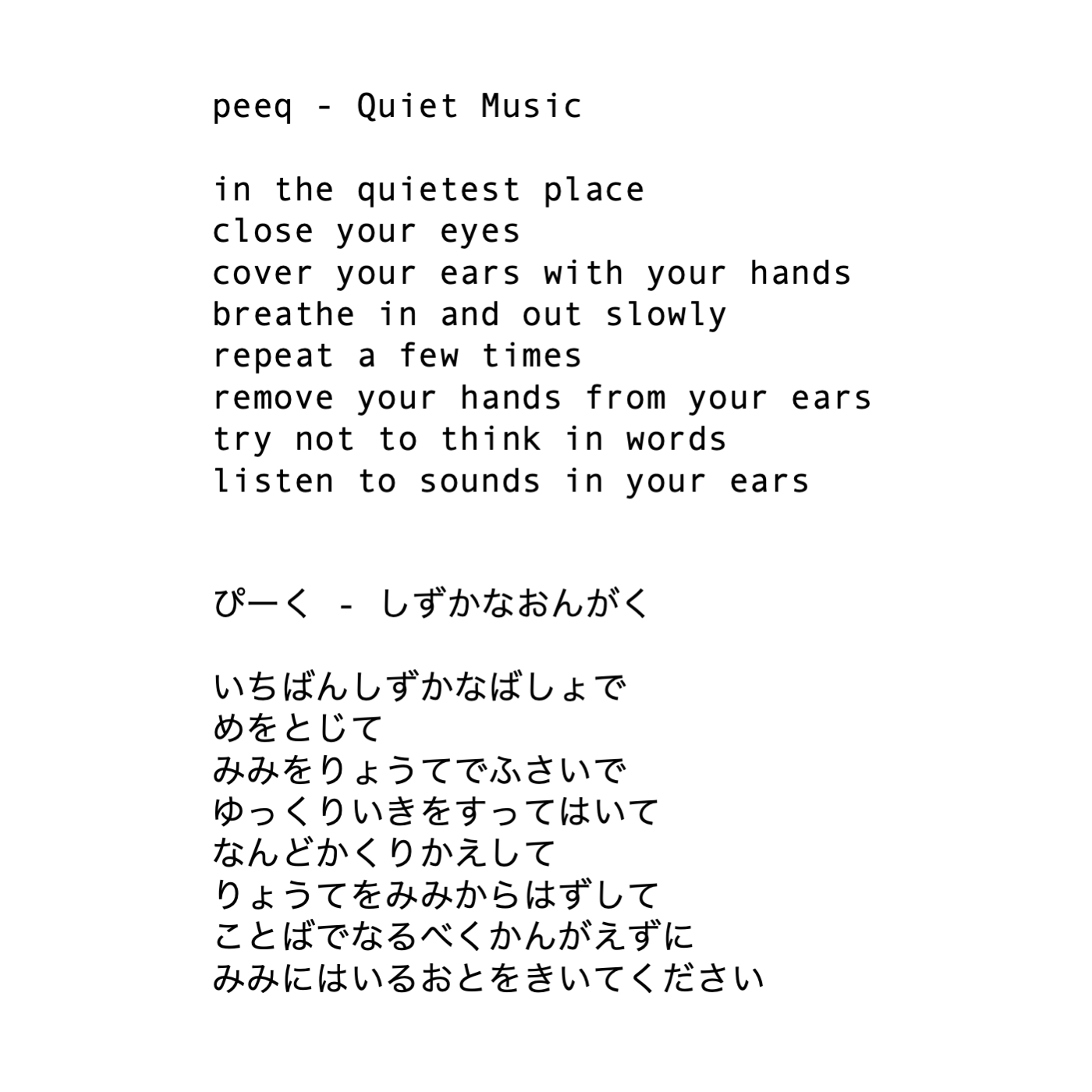 The large (25 track) compilation comes with a zip file of documents, midi files, SuperCollider patches, illustrations and video clips to explain process and allow listeners to implement some of them themselves. There’s lots of computer music in here, as well as some more hands-on work like nnirror’s drone piece with a self-explanatory title: microcassette motor & AC power brick surrounding an inductor (a video of which, if further evidence of process is required, comes with the download). I enjoyed the diversity in the ways people had responded to the theme – with some pieces only presented as text scores, such as peeq’s Quiet Music (below). As is often the way with big compilations of interesting stuff, I’ve added a bunch of the pieces to my bank of tracks for forthcoming shows.