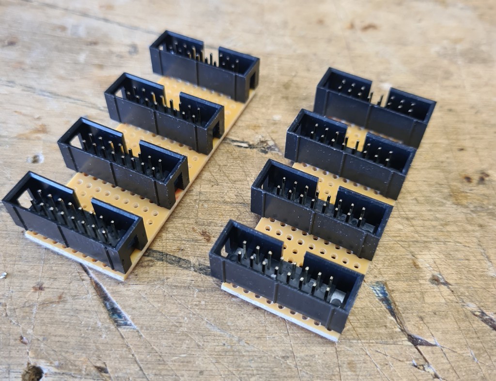 - For power distribution I bought some ‘flying bus cables’ from Thonk. [link] The Row Power has two sockets and I daisy-chained the third. I still didn’t have enough sockets so made some passive bus boards from vero-board and 16-pin sockets, like the ones below but longer. To be honest it doesn’t feel ideal daisy-chaining them like this, but according to the Row Power user manual this is a legitimate way to do it.
