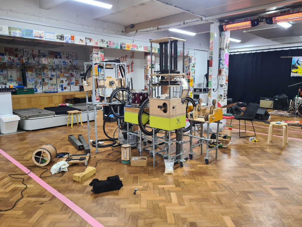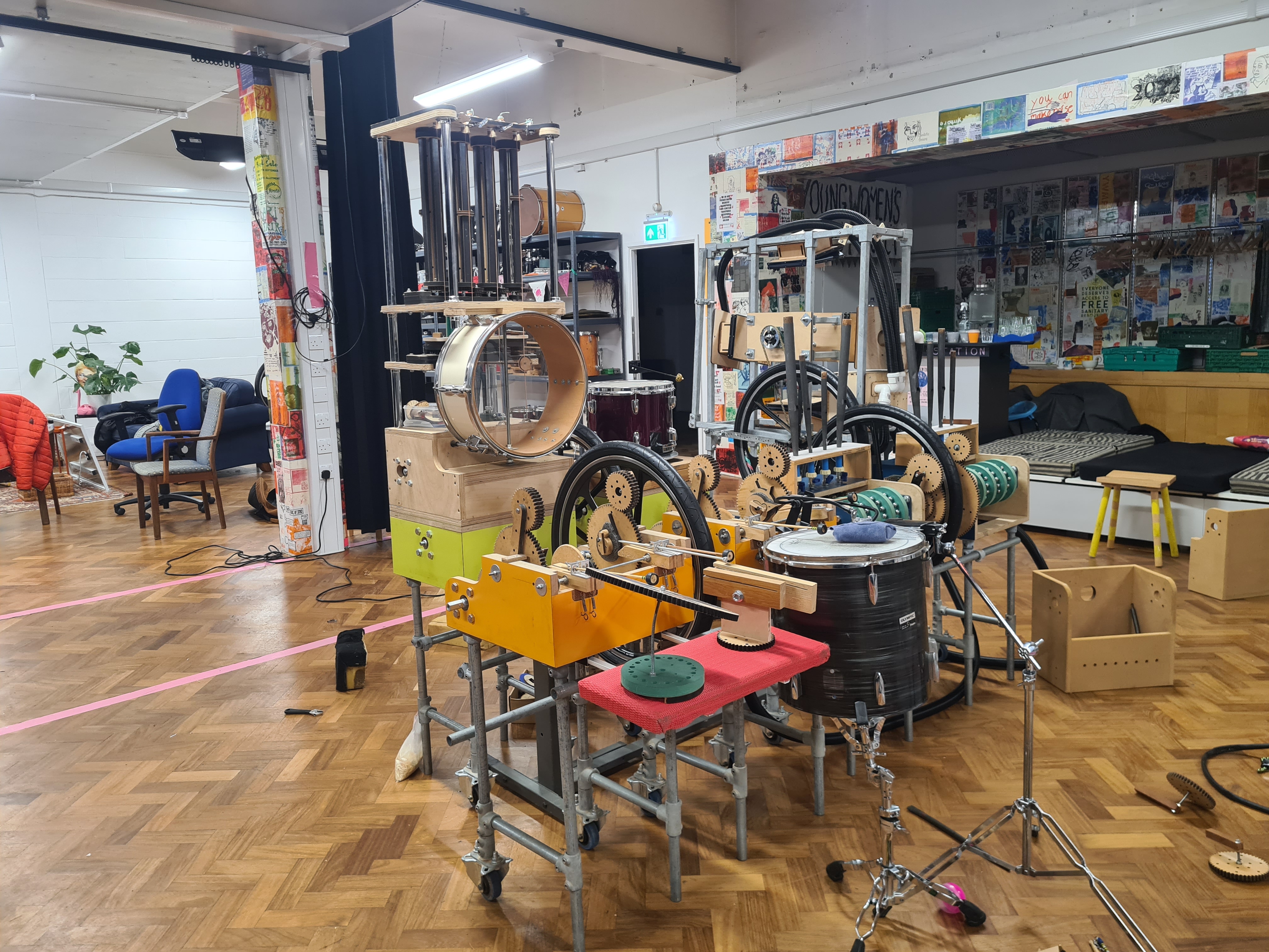 Me and two of the staff at The Nest started the day building the MBO. Though it’s big it’s designed to be somewhat portable, and various parts can be dismantled. Having assembled the parts and got everything in position we started the motor and everything was working fine. The drum module is possibly the most complex, with different gearing for different time signitures, a variety of cams in divisions of 4/8/16, 8 / 7 / 5 etc., and a load of different beaters to choose from. The air sequencer module has its own ideosyncracies too, and needs to be connected to the bellows (or a big pink balloon) in order to play. Swapping round organ pipes is a nice way to create variation in patterns, and as an unusual way of interacting with a sequencer is perhaps not the most intuitive way to play an instrument. The various noise makers – tombola, drone drum, rotating bin – on the utility module all required their own explanations. And finally the bass banjo with various different pluckers, hurdy-gurdy wheels and dampners.
