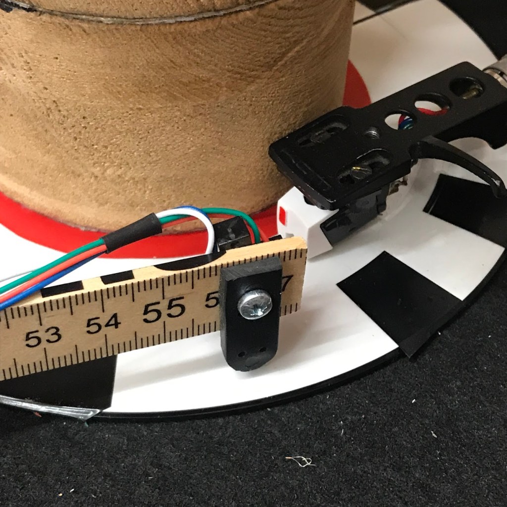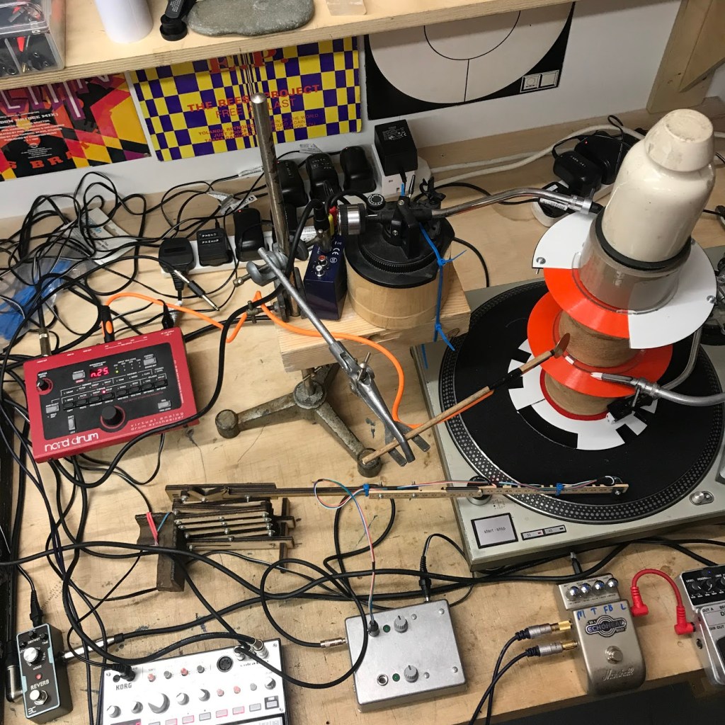 My remix for Sculpture was a lot more open-ended to begin with, as the release consisted of a five-inch picture disc with several locked grooves on each side. That is, there wasn’t really a ‘song’ to remix as such. I was given two copies of the disc, pre-picture adding, and at seven-inch size not five-inch. Some odd objects really. I made three hybrid discs from these (pictured), for use with the various interfaces from the Mechanical Techno setup. One disc I cut in half, flipped one section and re-stuck, adding some black stickers to the blank (non-etched) outer rim to use with the optical reflection sensor. The other I cut a quarter from and matched that with a chopped up 1950s children’s music disc (in fetching orange colour), adding pegs to one of the discs to trigger drum sounds. For the remix itself I played all three records simultaneously on a tower, with a tone arm on each record, optical sensor for a Volca Bass clock and triggers for drum sounds. The output was a live mixdown, with quite a lot of sound from the original Sculpture locked grooves.