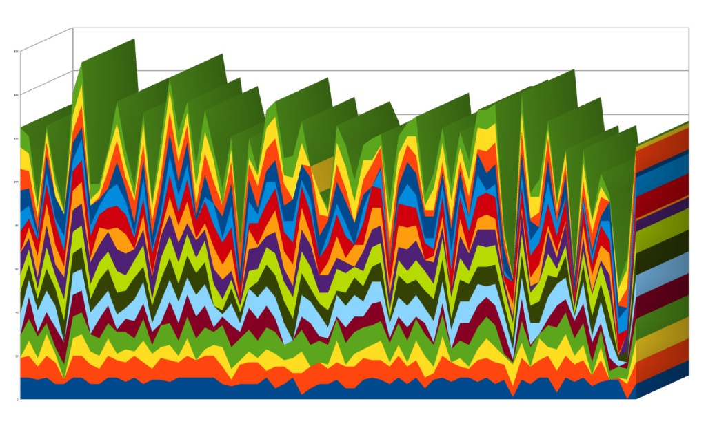 The video consists of graphs made in a spreadsheet software, scrolling across the view. The audio is made of 16 drone sounds, each generated by a graph of results from one of the questions. The drones were pitched digitally then fed through oscillating analogue synth filters and left to run for the duration of the recording.