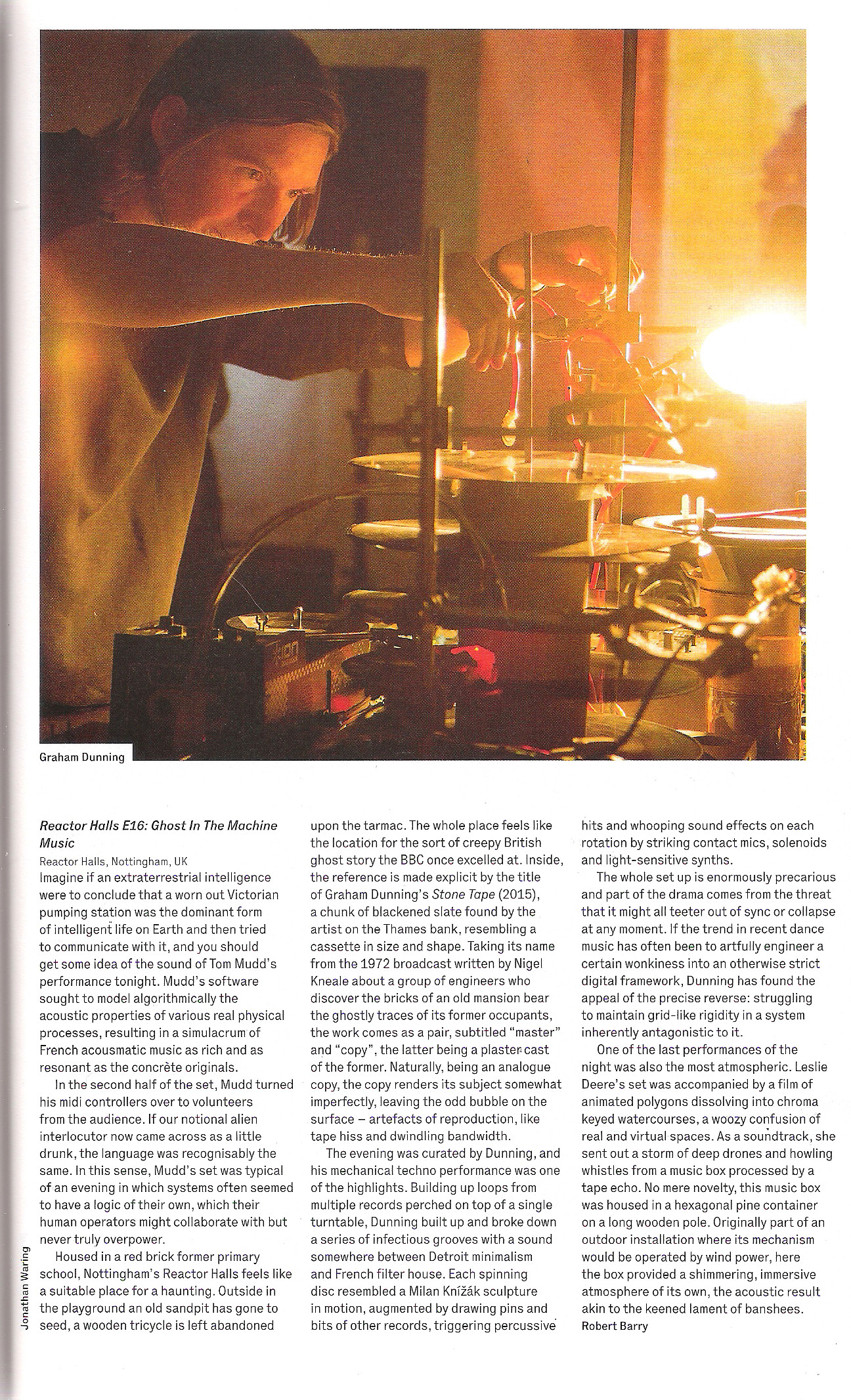 The whole set up is enormously precarious and part of the drama comes from the fact that it might all teeter out of sync or collapse at any moment. If the trend in recent dance music has been to artfully engineer a certain wonkiness into an otherwise strict digital framework, Dunning has found the appeal of the precise reverse: struggling to maintain grid-like rigidity in a system inherently antagonistic to it. – Wire Magazine, August 2015 [link]